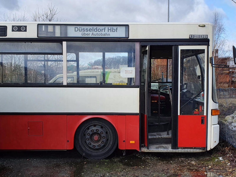 Relativ kurzfristig besichtigten wir unseren Wagen 6008 der Rheinbahn im Sommer 2020 bei einem Fahrzeugverwerter in der Nähe von Bremen. Mit dem Baujahr 1986 besitzt der Bus noch einige Besonderheiten wie zum Beispiel andere Wandverkleidungen, andere Abdeckungen der Deckenlampen und die alten Kiekert-Türen, außerdem besitzt er die Stadtbusbestuhlung in einer 2+1-Ausführung mit Lederbezügen.